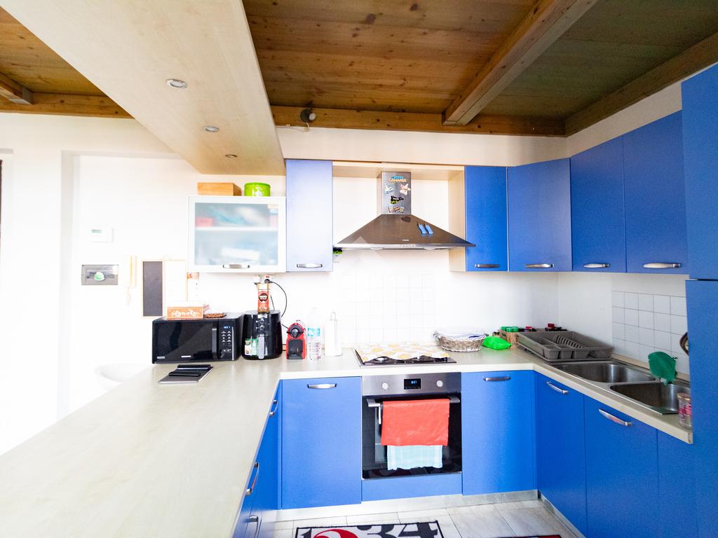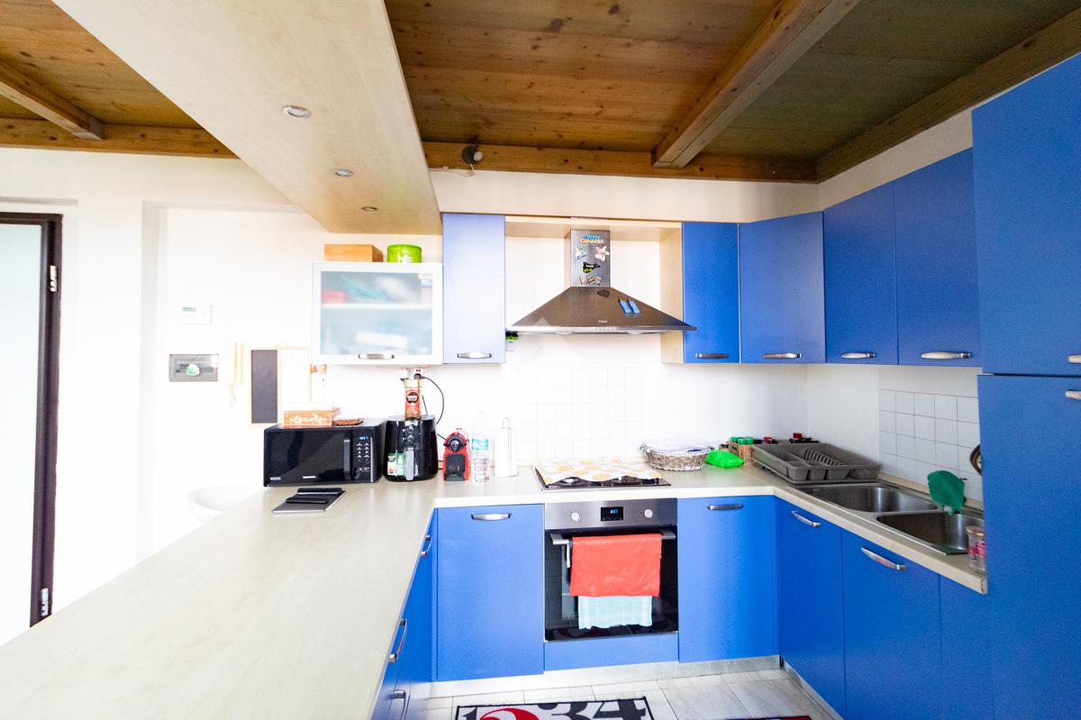 L'ingresso affaccia nella luminosa zona giorno open space in cui troviamo il soggiorno con angolo cottura e il primo bagno.