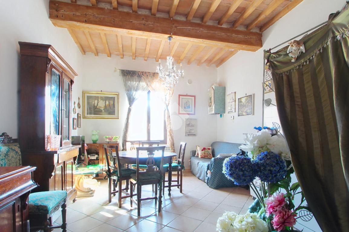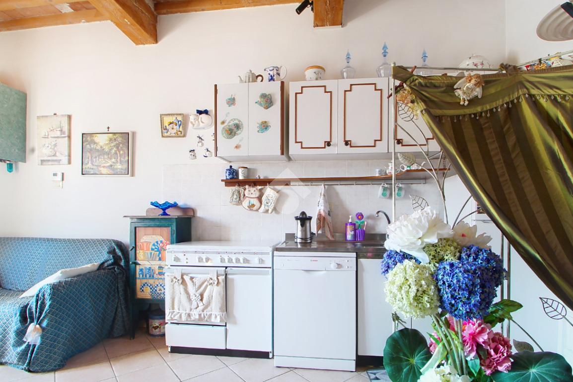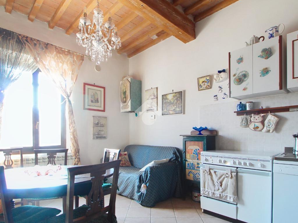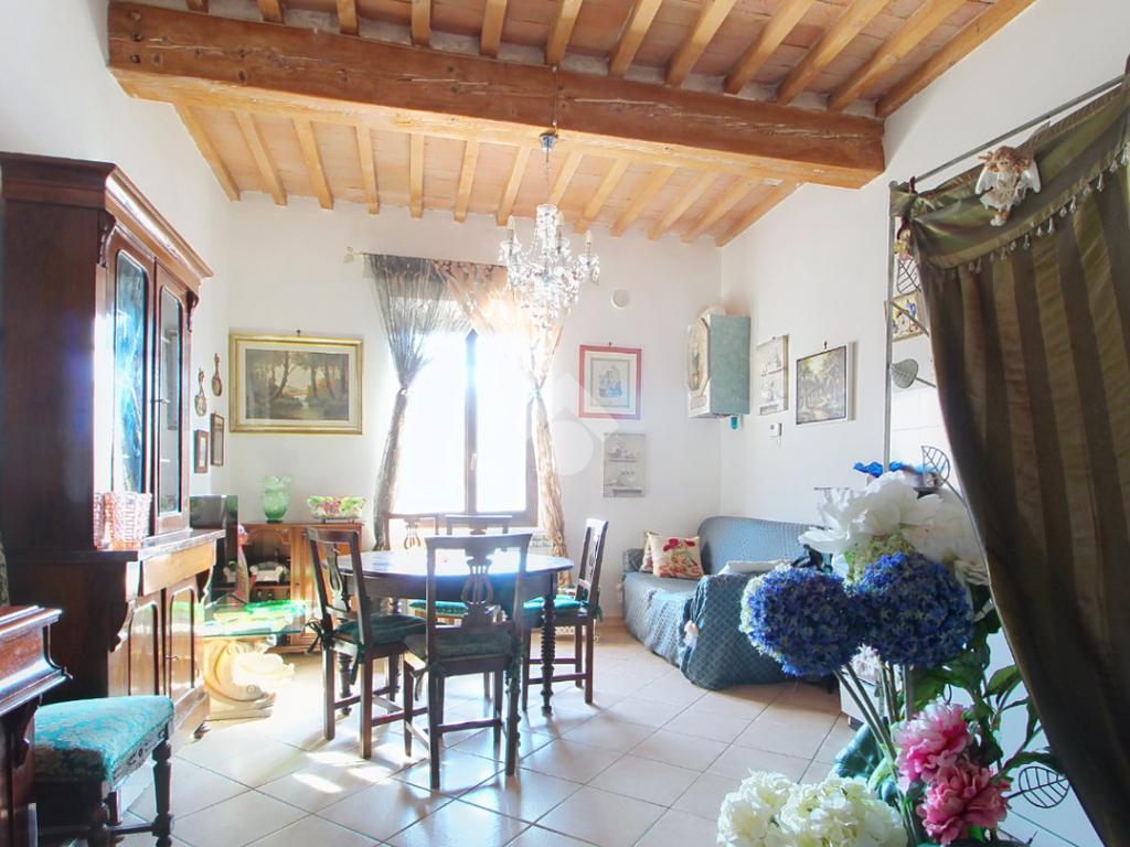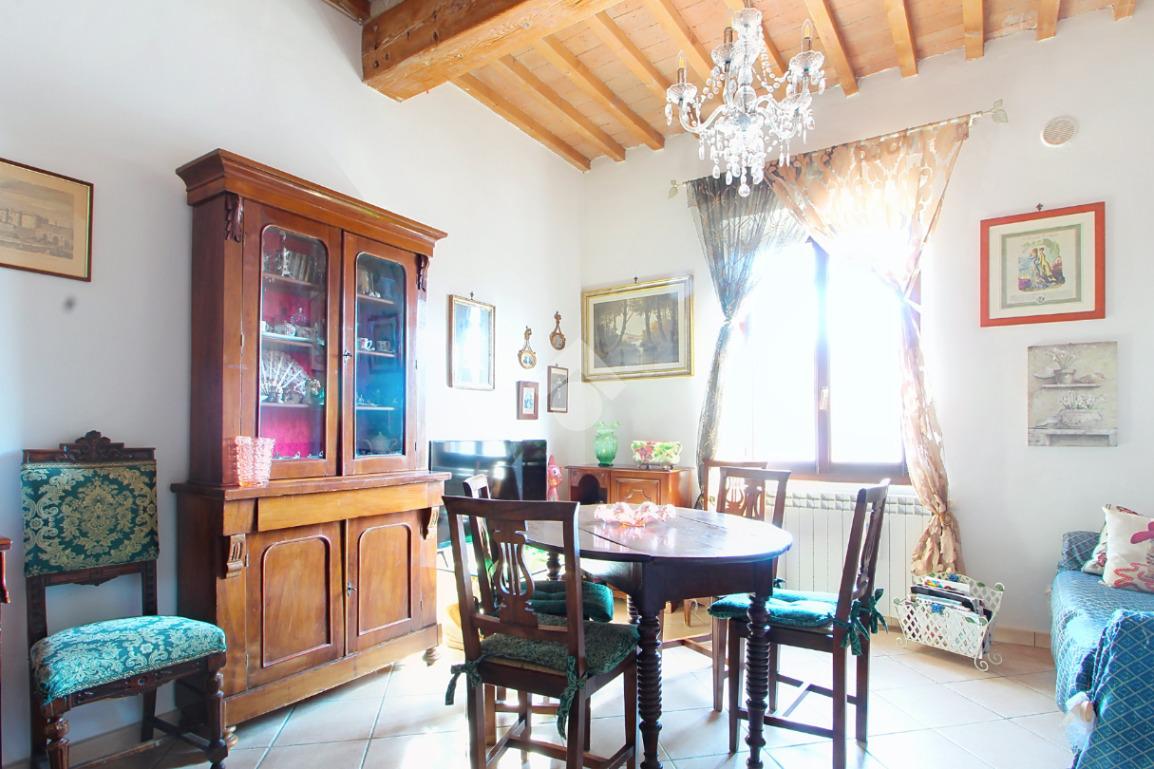 L'ingresso affaccia sulla luminosa zona giorno, dotata di soggiorno con angolo cottura, e caratterizzata dal soffitto con travi a vista.