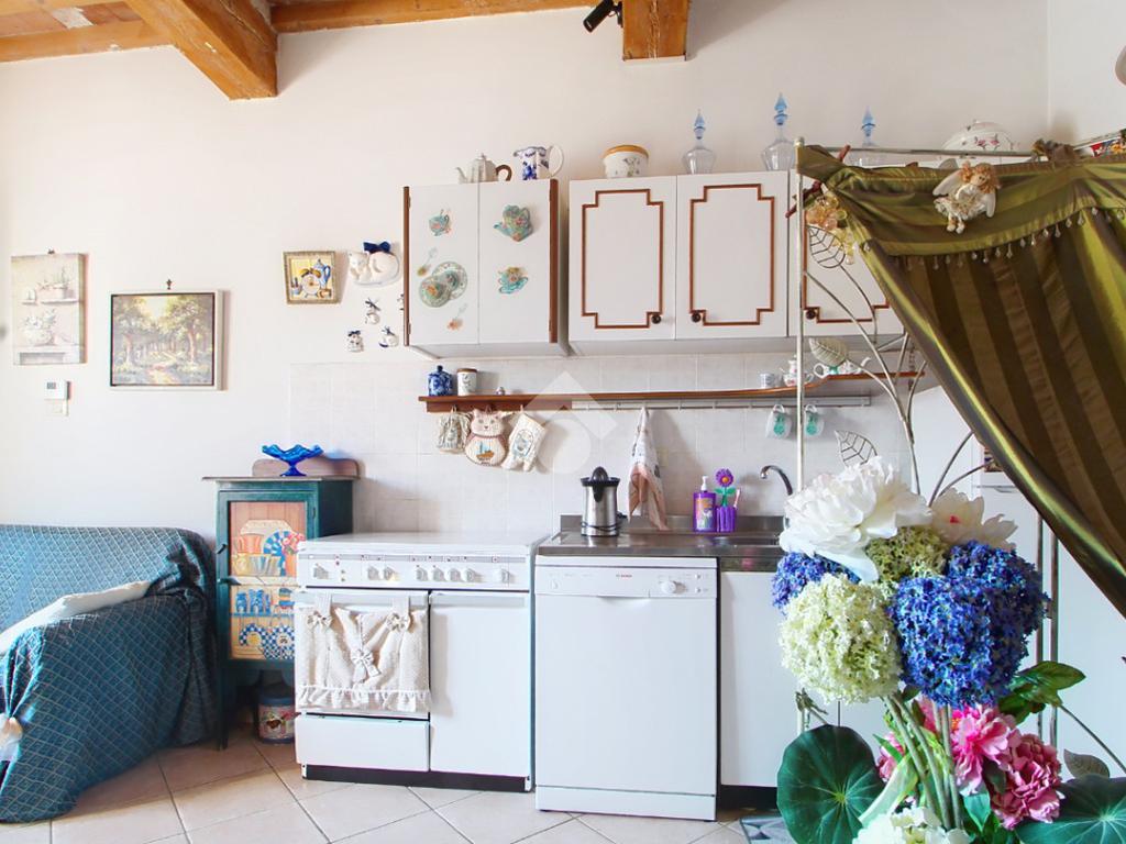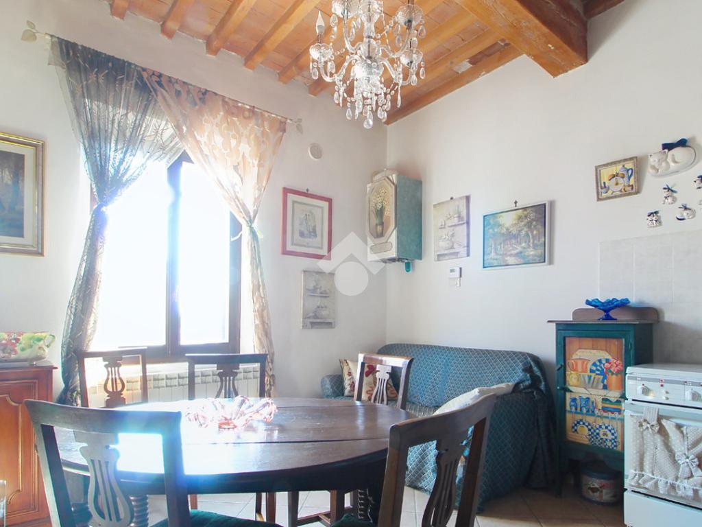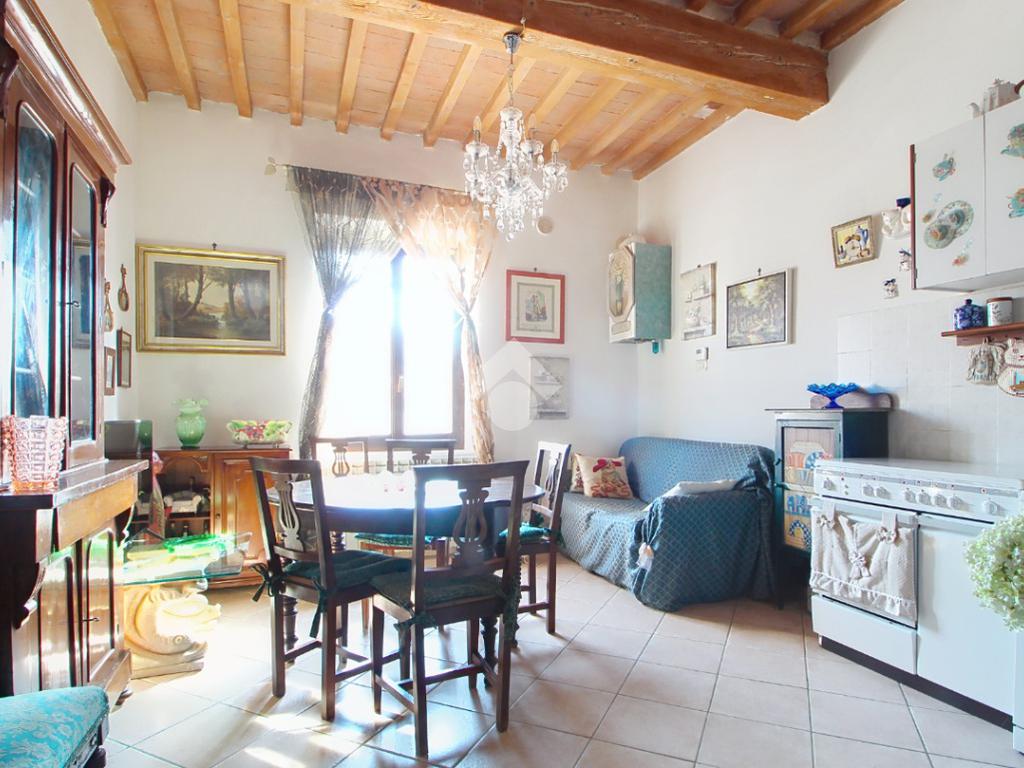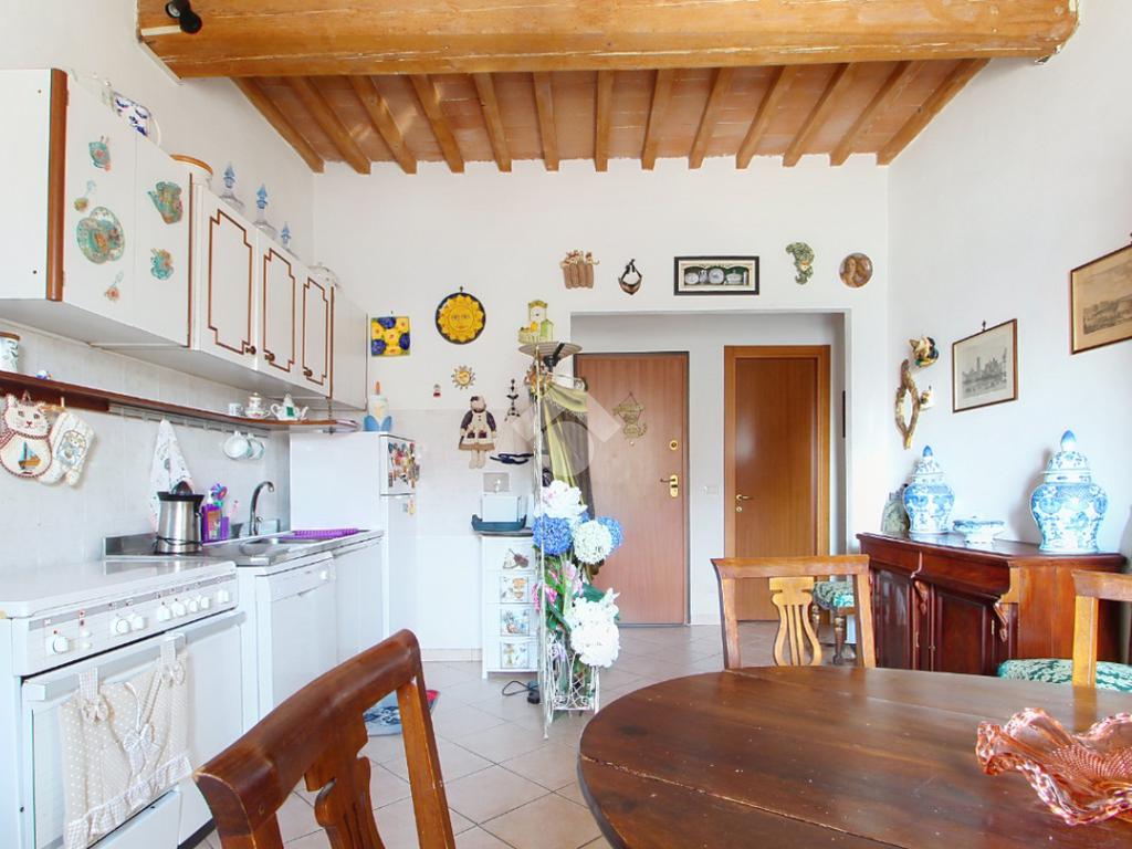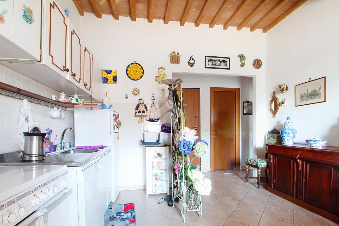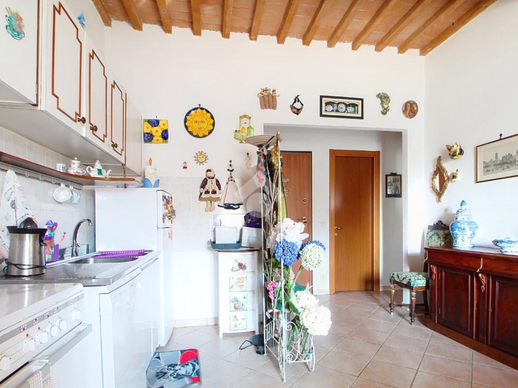 L'ingresso affaccia sulla luminosa zona giorno, dotata di soggiorno con angolo cottura, e caratterizzata dal soffitto con travi a vista.