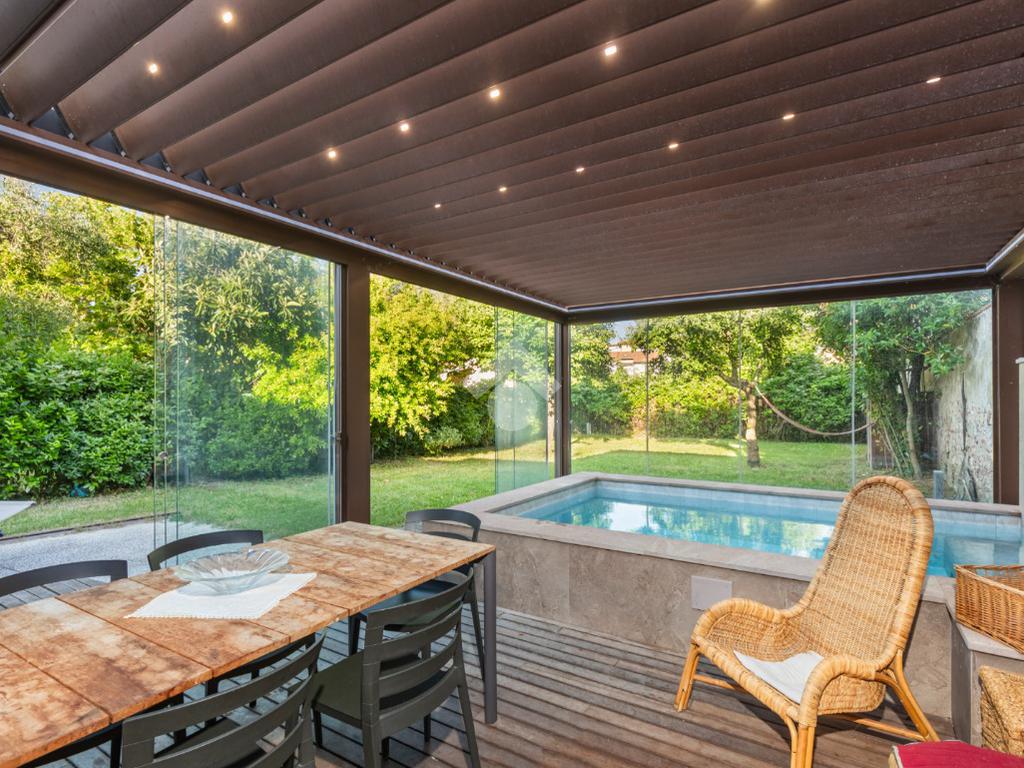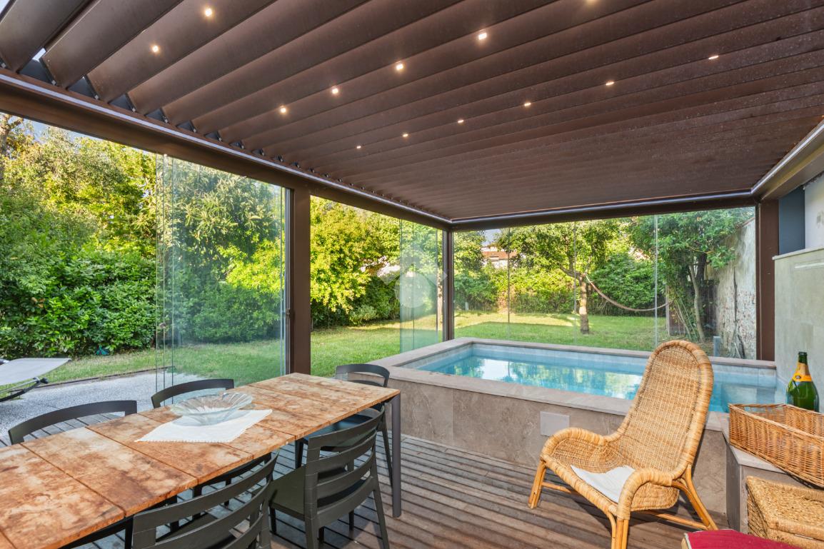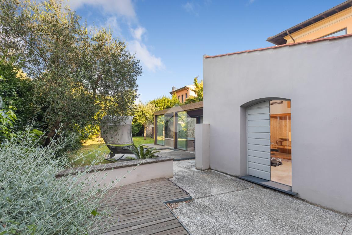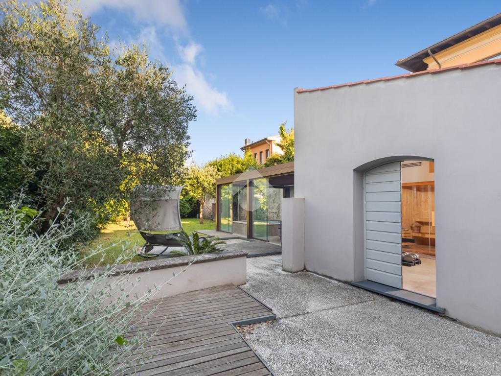 Dal piano terra si accede al fiore all’occhiello della casa: un giardino privato di 300 mq con veranda, piscina riscaldata con idromassaggio e un esclusivo centro benessere completo di sauna, palestra e un bagno dedicato. Un angolo di puro relax, pensato per vivere la casa come una vera oasi privata.