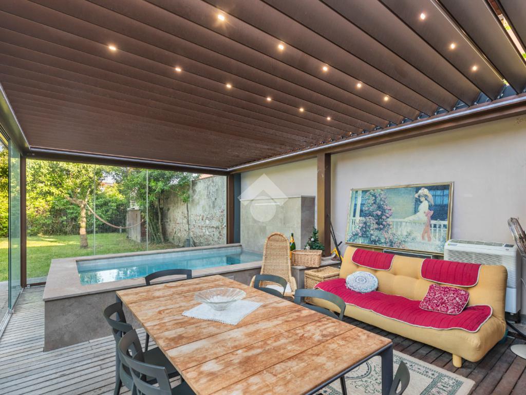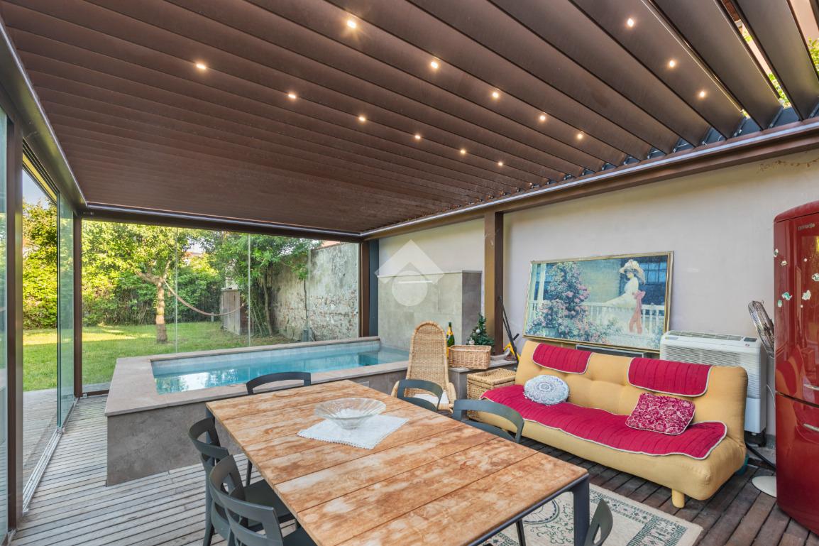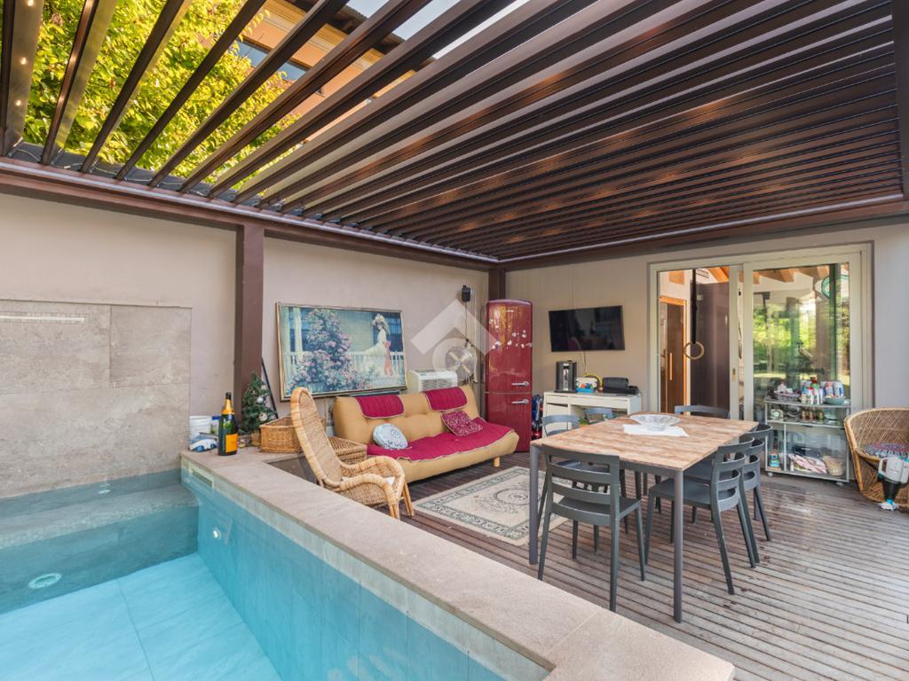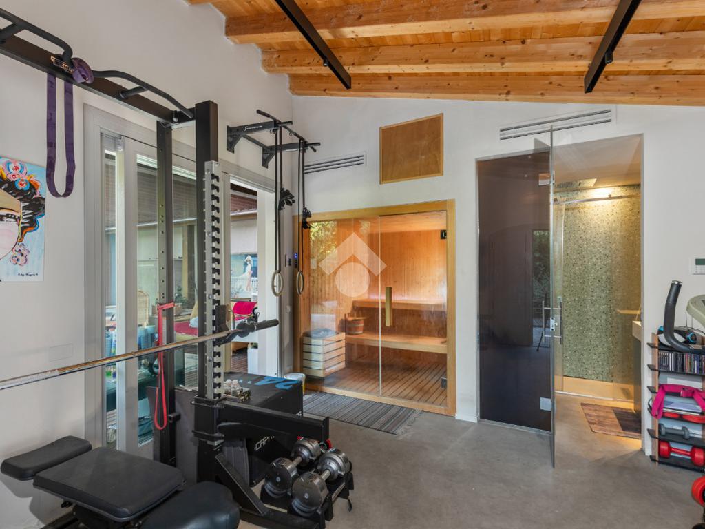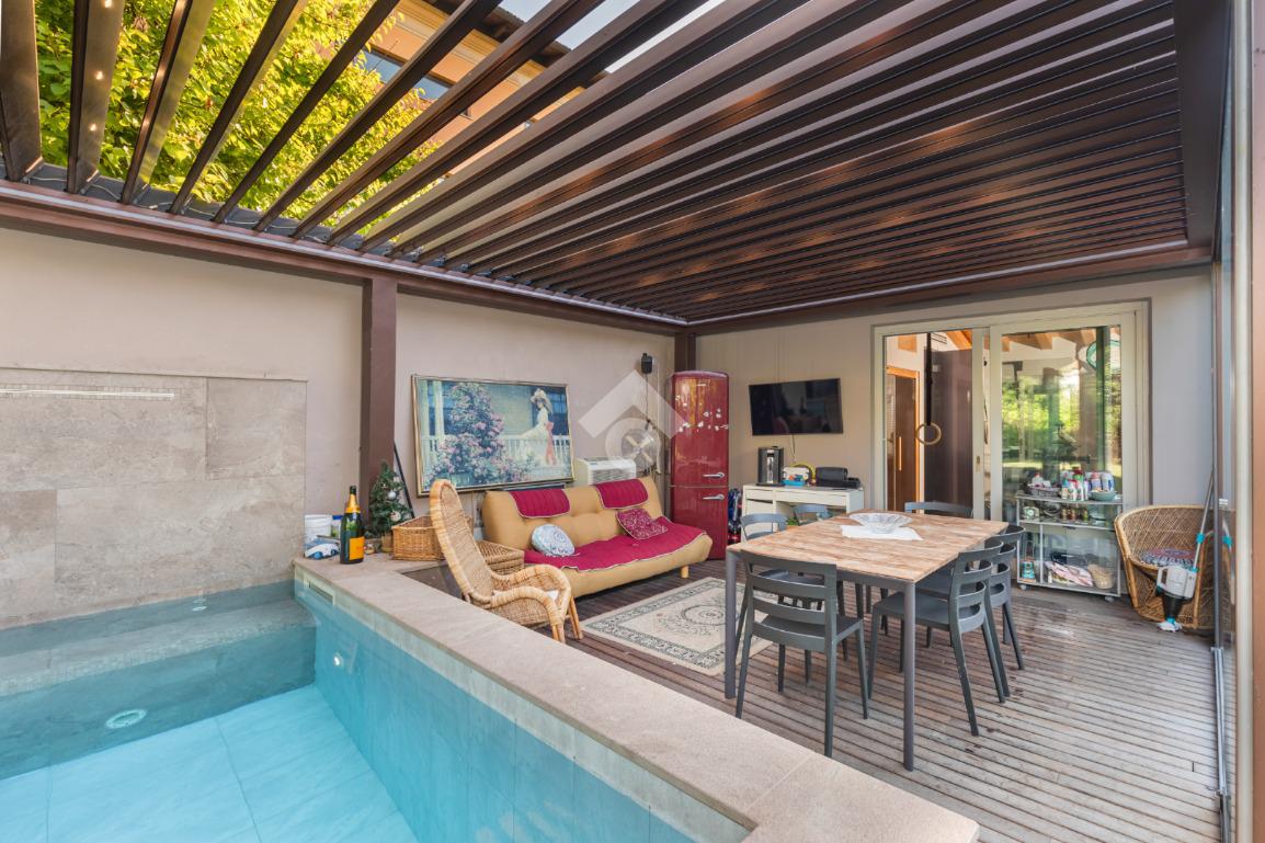 Dal piano terra si accede al fiore all’occhiello della casa: un giardino privato di 300 mq con veranda, piscina riscaldata con idromassaggio e un esclusivo centro benessere completo di sauna, palestra e un bagno dedicato. Un angolo di puro relax, pensato per vivere la casa come una vera oasi privata.